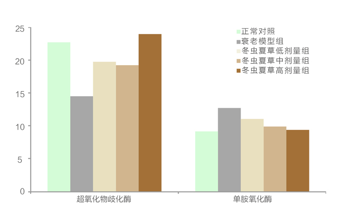 结果显示:冬虫夏草能有效提高衰老动物的学习记忆成绩,不同程度提高衰老小鼠肝、脑、红细胞的超氧化物歧化酶、谷胱甘肽过氧化物酶、过氧化氢酶活性,提高脑中Na+-K+-ATP酶活性,降低脑中单胺氧化酶活性,降低肝、脑中过氧化脂质的分解产物丙二醛的含量。