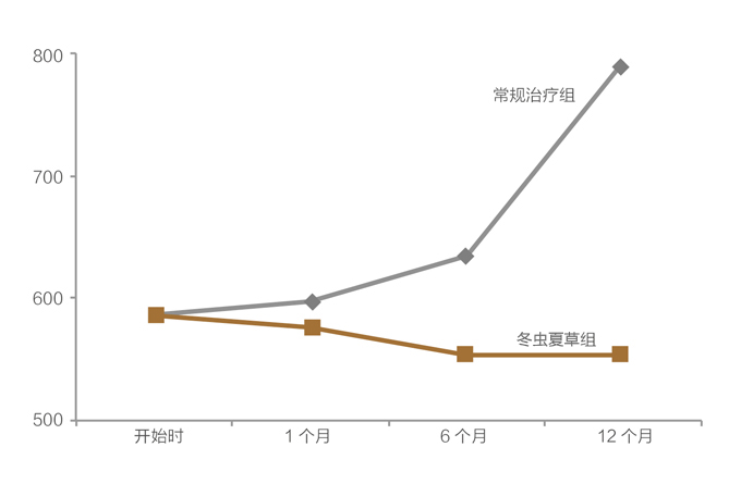 1-肾功能不全代偿期患者,冬虫夏草组在6个月时效果与常规治疗组相比已经有统计学差异,12个月时有显著差异。