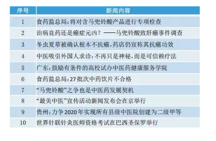 上一监测周期(10月28日~11月3日),“马兜铃酸事件”讨论热度依然很高,同时,“冬虫夏草不抗癌”这一话题成为新的关注点。监测显示,微信平台共发布1.28万条中医药相关图文消息,微博平台共推送2.75万条信息。转载热度前十的新闻如图: